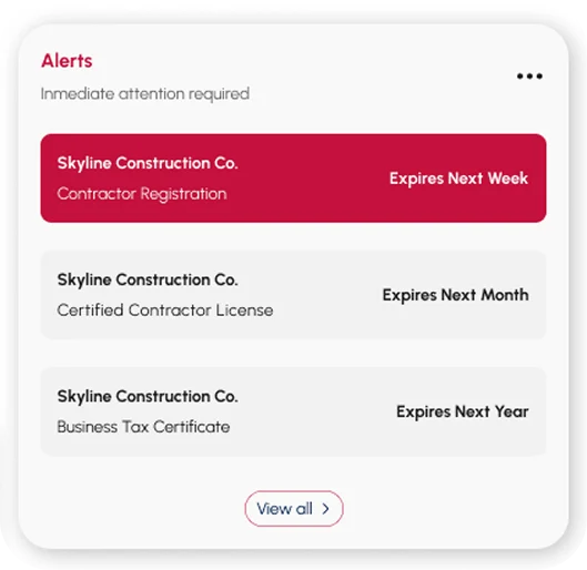 Built for contractors, licensing coordinators, and compliance teams, our cloud-based platform delivers complete visibility and control—so you can manage every license, renewal, and requirement from one powerful dashboard.